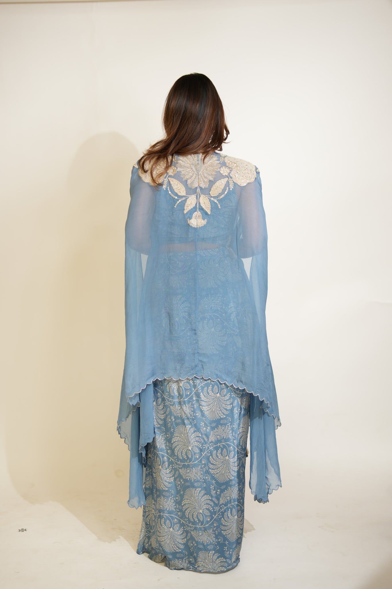 Turn heads in this modern blue skirt set featuring intricate floral embroidery, a stylish asymmetric skirt, and a soft draped dupatta. Lightweight, elegant, and effortlessly contemporary — perfect for cocktail nights, sangeet events, and festive celebrations.