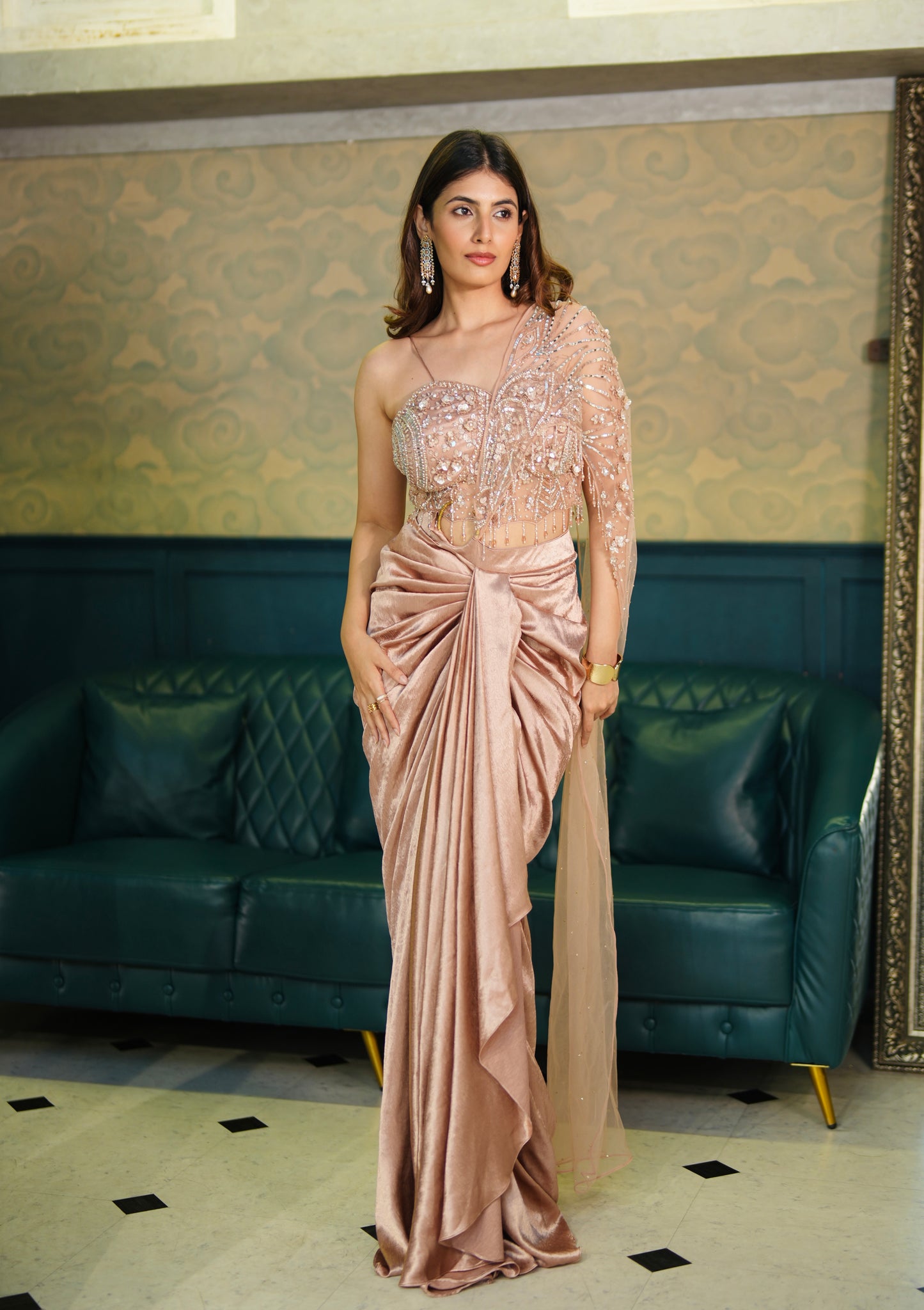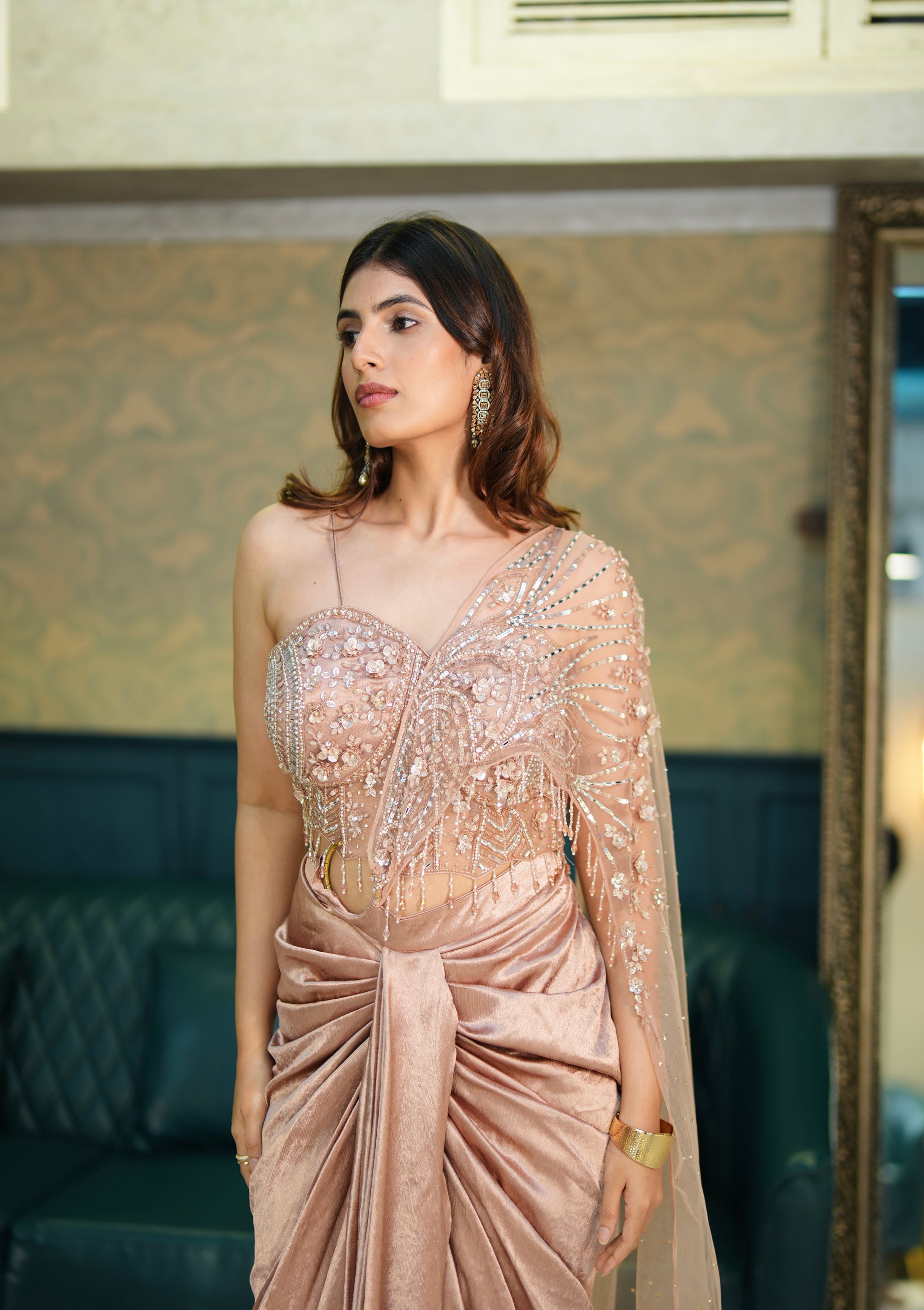 Style Tip: Pair this blush pink drape set with statement earrings, nude heels, and soft curls. Add minimal makeup and a clutch for an effortlessly elegant evening look.